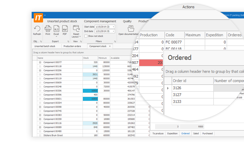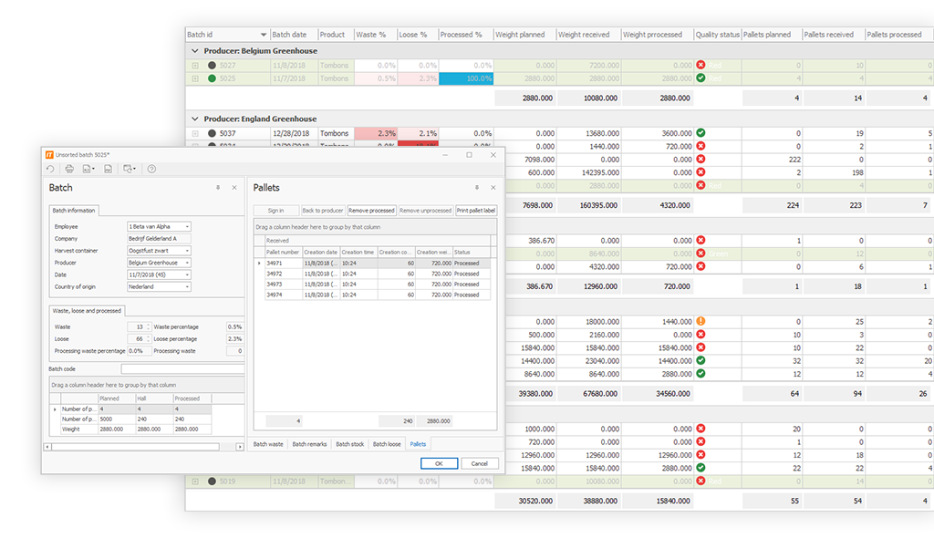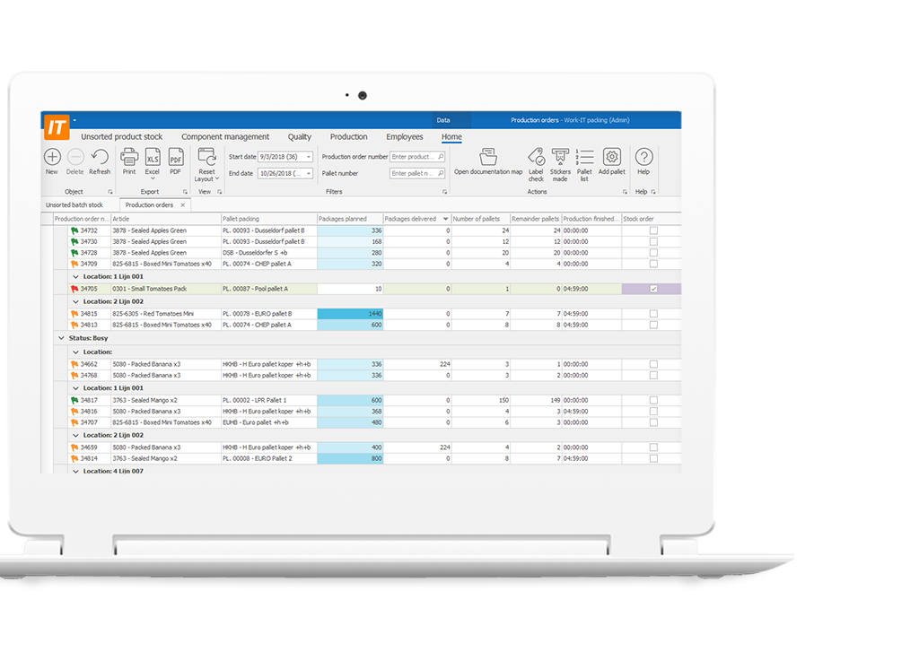 When the unpacked products arrive, the data of the weight and variety are entered into the software, existing stock levels are automatically adjusted. It is possible to make pallets from the producer so that the packaging location can anticipate its function and activities. With the help of barcode technology and extensive tracking & tracing functions the entire life cycle from product to the article is clear at any time.